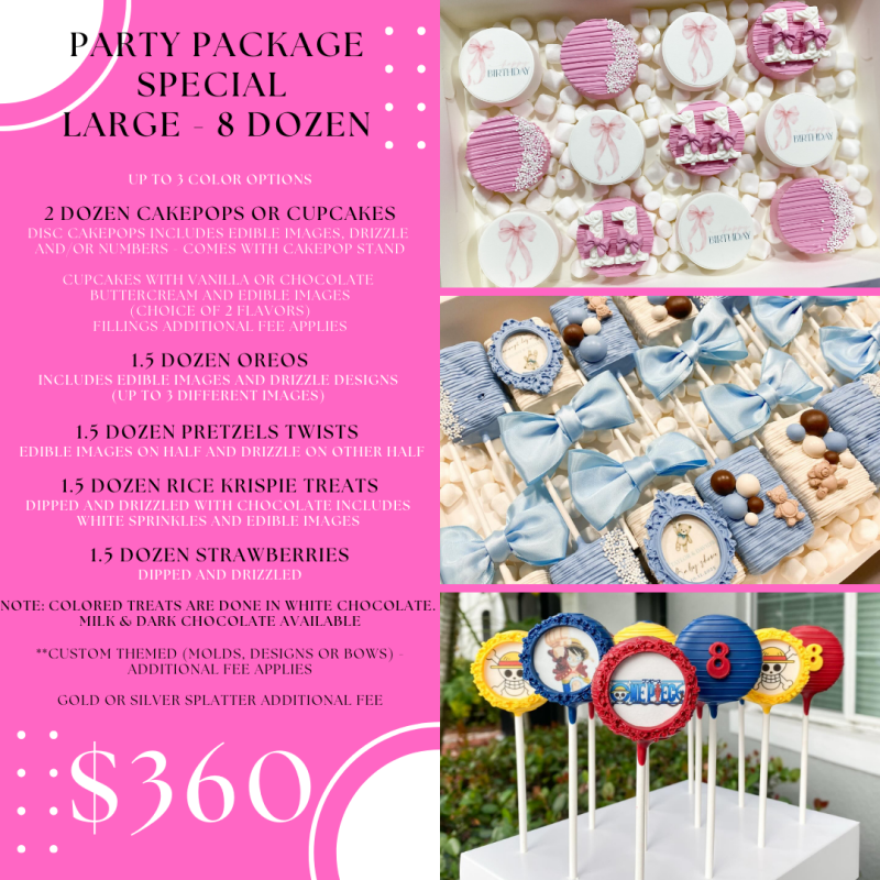 Make your next celebration extra sweet with Wickedly Whipped Desserts! We offer party packages featuring our beautifully handcrafted dipped treats — perfect for birthdays, showers, corporate events, and more. Strawberries, Oreos, Pretzels, Rice Krispie Treats, Cake Pops and Cupcakes, all dipped and decorated to match your theme.